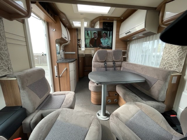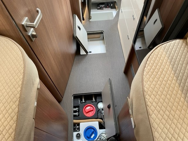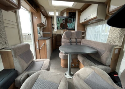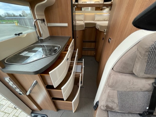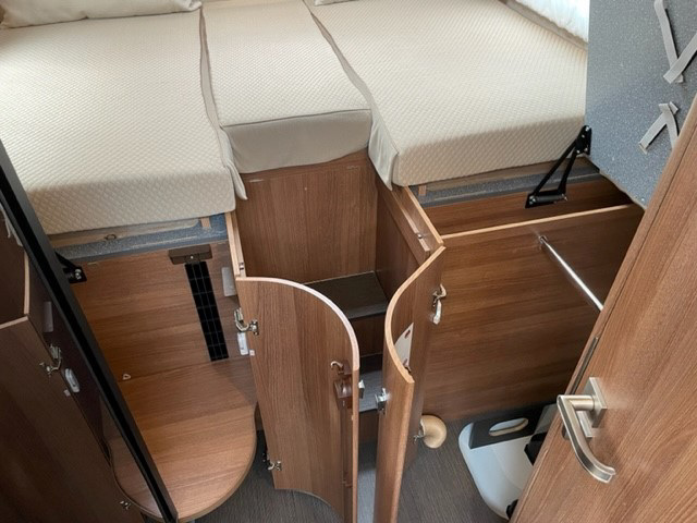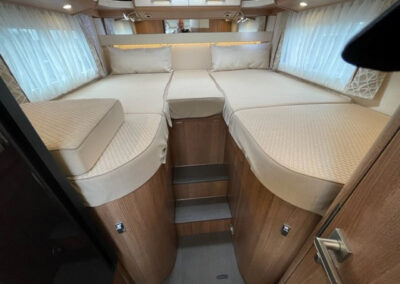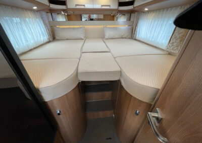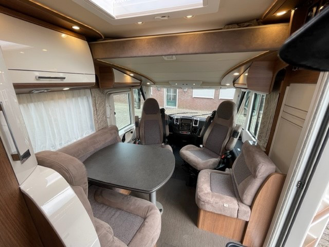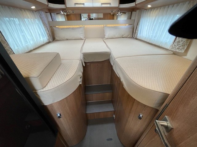 Enkele bedden of groot vastbed, hefbed, grote garage met 2 deuren (2e deur is extra optie), l-zithoek + 1 persoons bankje, 2x in hoogte verstelbare pilote draaistoel met armleuningen, toiletruimte met aparte douche, dubbele bodem.